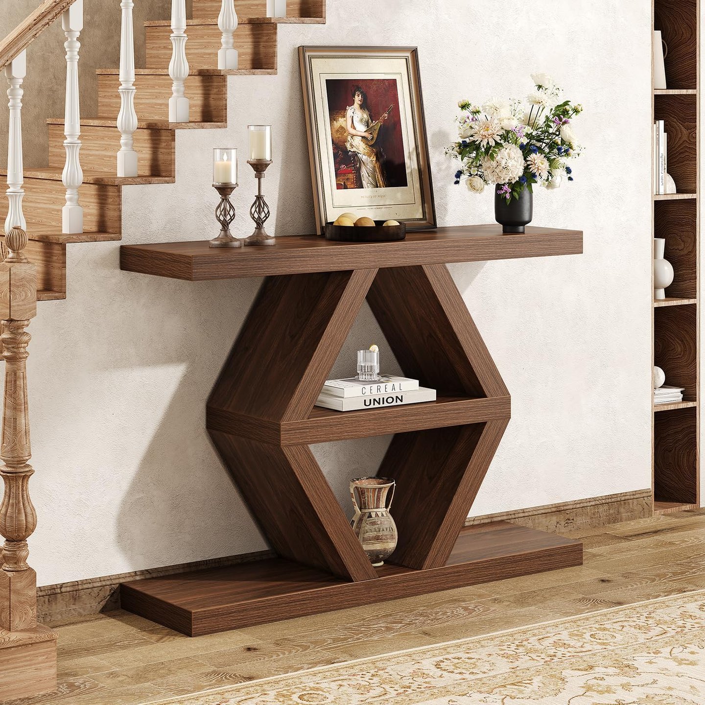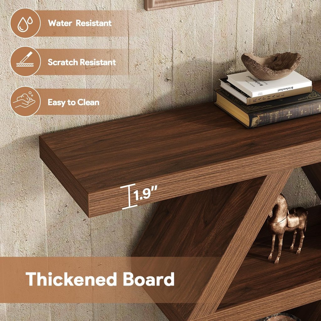【Unique 3-Tier Staggered Design】 This modern entryway console table features a distinctive layout with a long top (39.4”) and bottom shelf, flanking a shorter central tier (18.7”). This creates captivating visual interest and versatile display levels for your decor, making it a stunning wooden entryway table and a functional console table that blends farmhouse charm with modern lines.