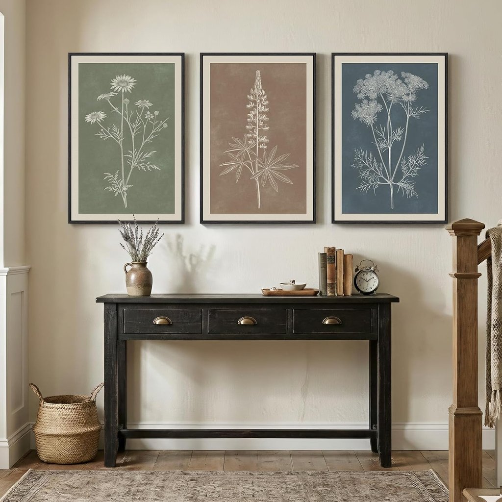 This wood-framed boho botanical wall art set includes three large vertical pieces (24x36 inches each) featuring antique-inspired botanical illustrations in a minimalist, neutral style. The solid wood black frames add a clean, modern contrast while still fitting beautifully with rustic farmhouse and boho-style interiors.