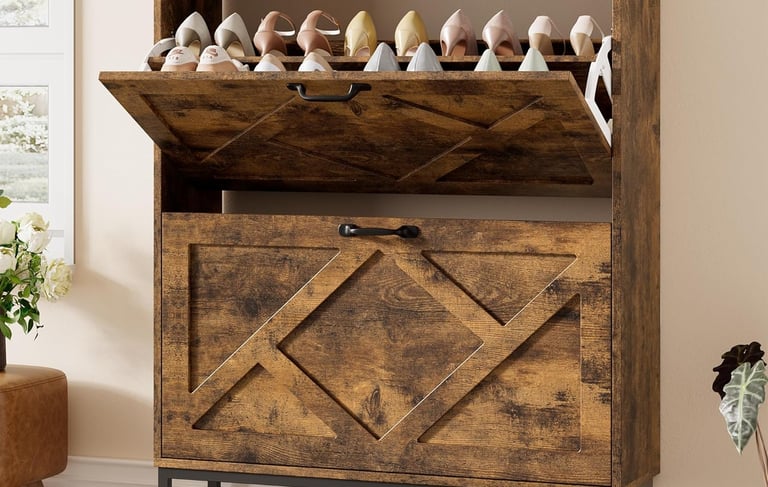 Stylish Flip Drawers: This rustic-style cabinet with 2 flip drawers provides easy access and keeps shoes organized and protected.