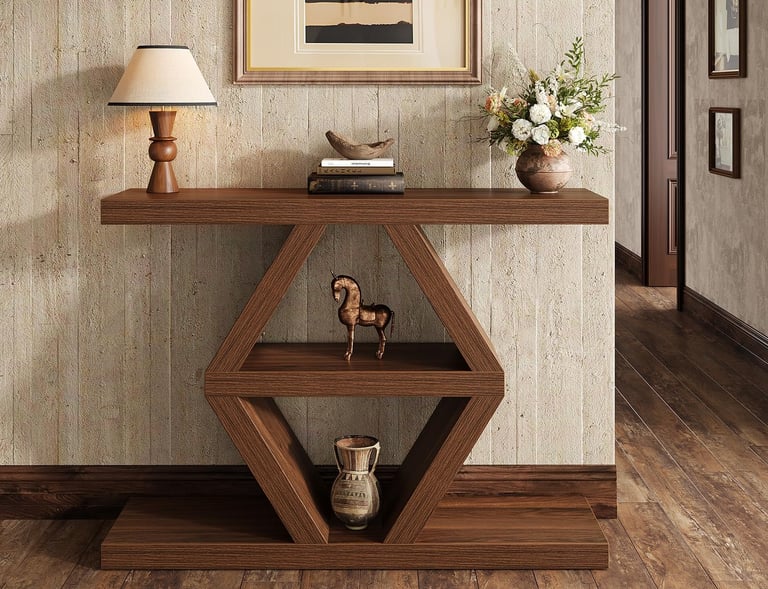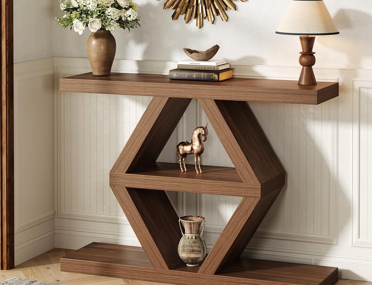 【Unique 3-Tier Staggered Design】 This modern entryway console table features a distinctive layout with a long top (39.4”) and bottom shelf, flanking a shorter central tier (18.7”). This creates captivating visual interest and versatile display levels for your decor, making it a stunning wooden entryway table and a functional console table that blends farmhouse charm with modern lines.