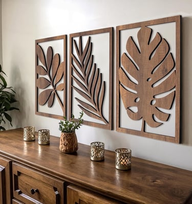 Modern wall sculptures crafted from durable, sustainable 8mm engineered wood in Walnut or Oak, combining artistry and natural textures for a timeless, sophisticated look. Easy to install and larger than typical designs, they create striking focal points in bedrooms, living rooms, kitchens, or offices. Eco-conscious, versatile, and gift-ready, these pieces bring warmth, elegance, and a touch of nature to any space.